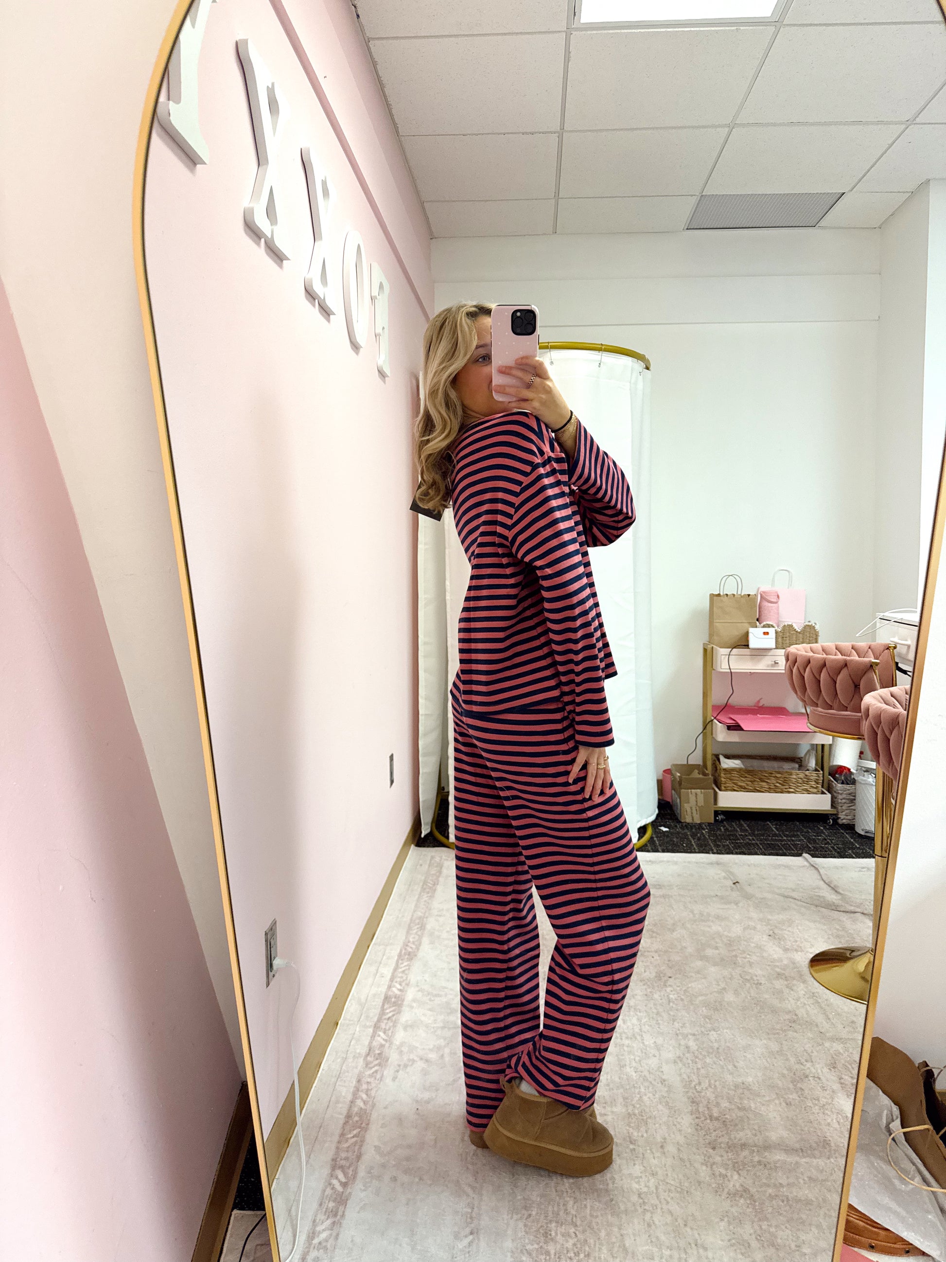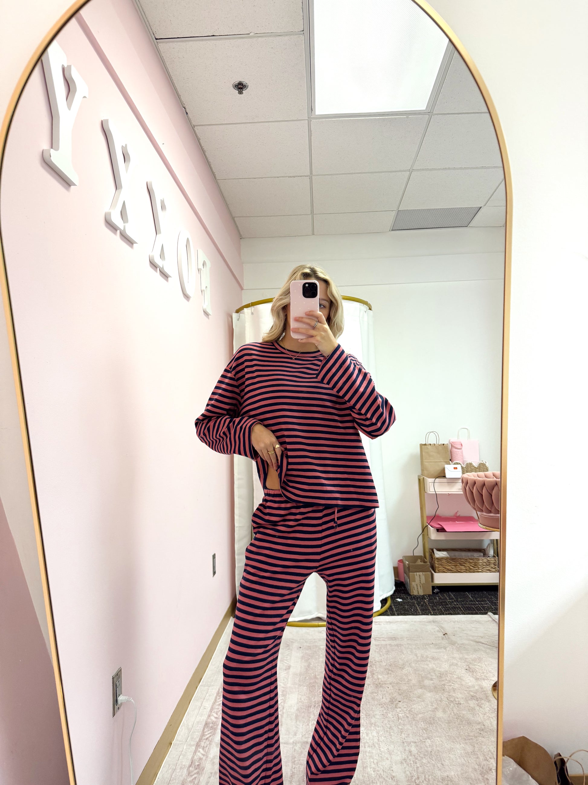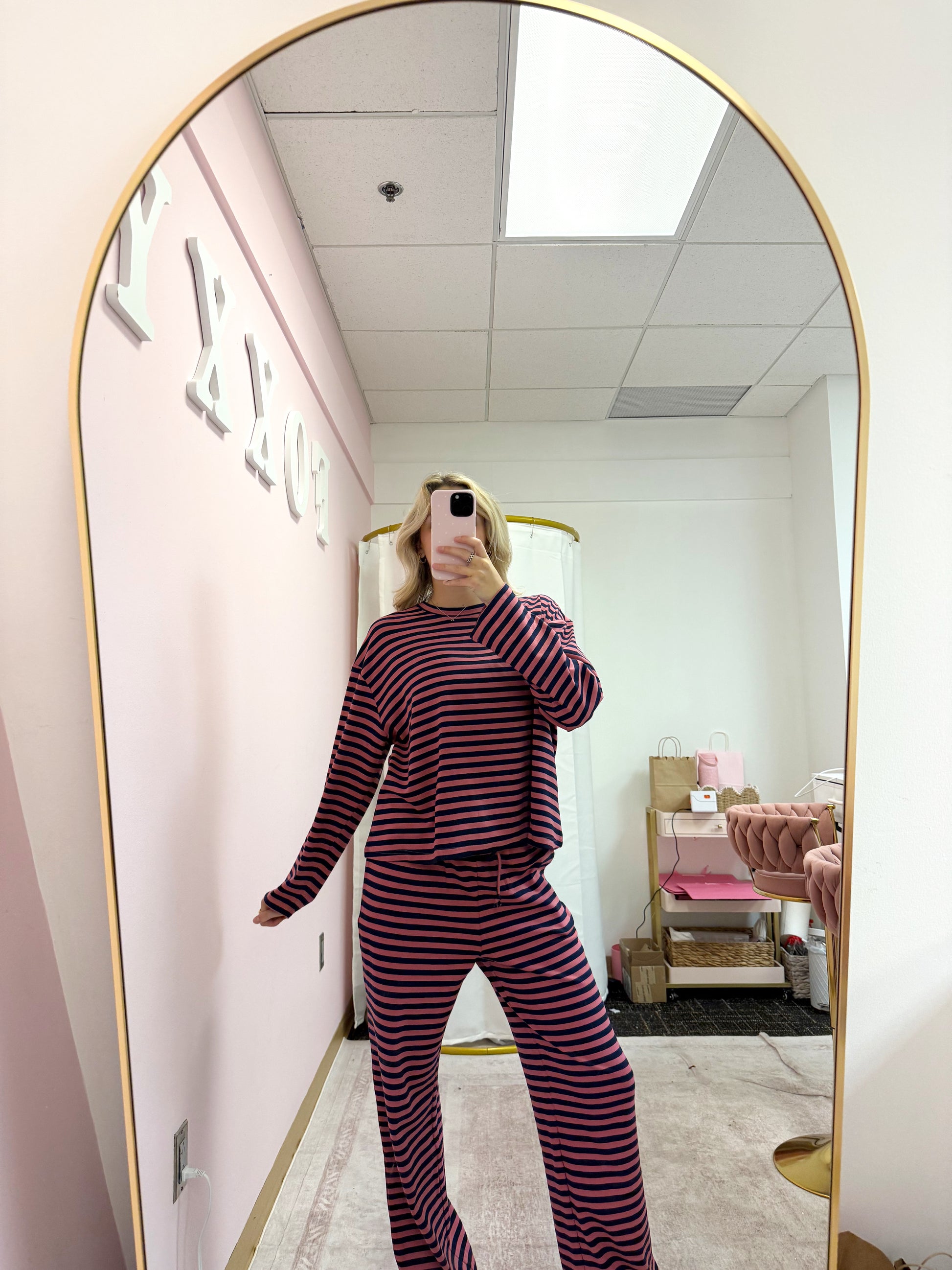 - Bold magenta and navy horizontal stripes for a pop of color