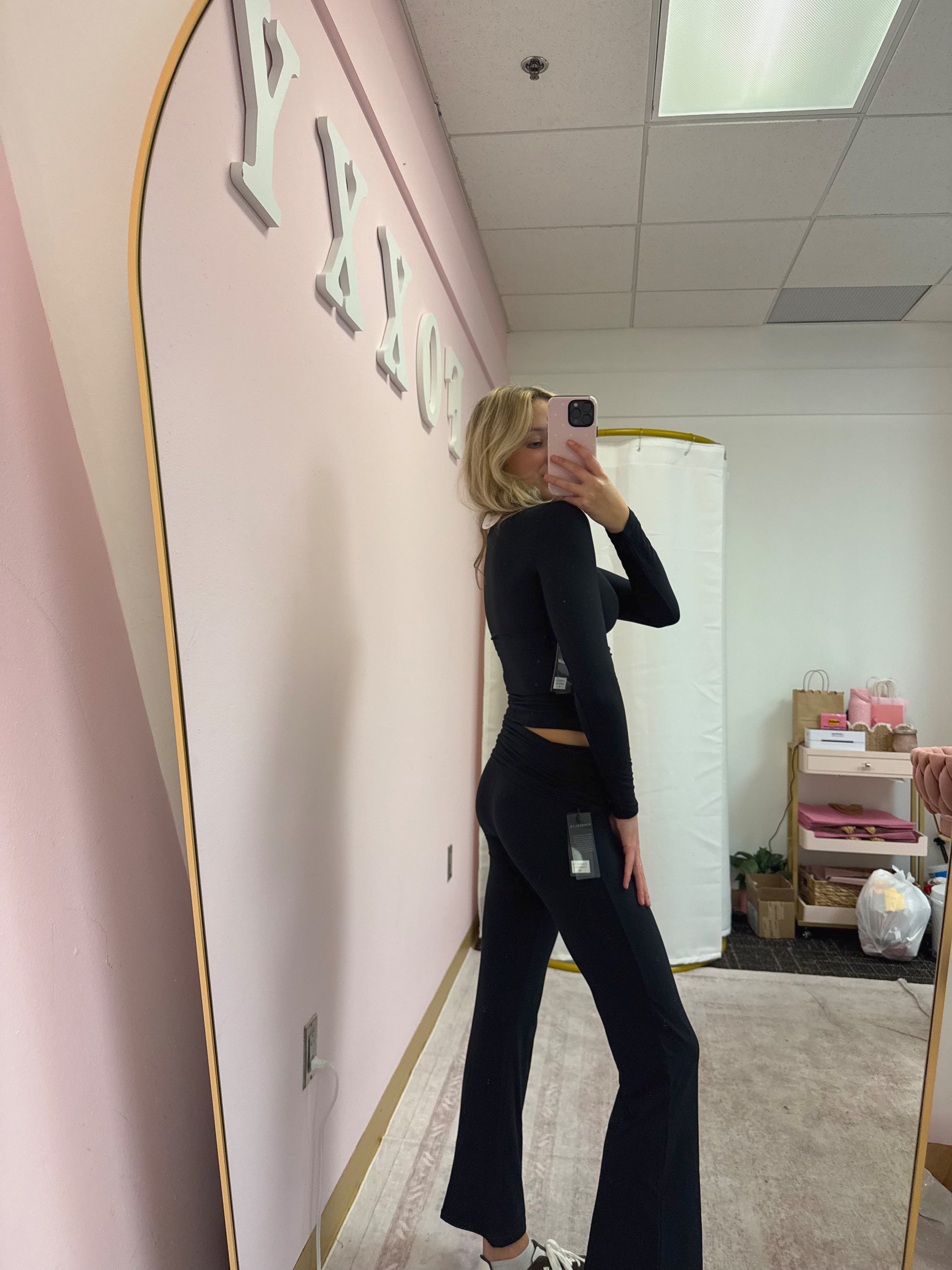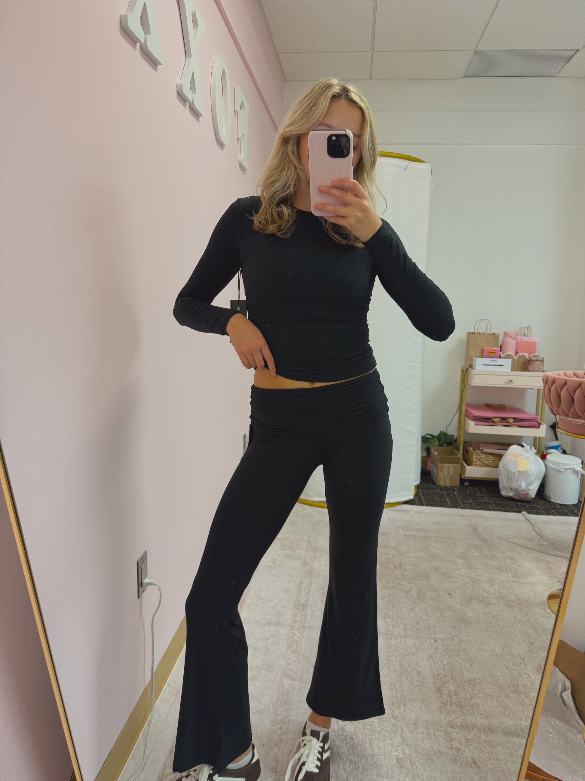 - Matching fold-over waistband flare pants for a lengthened silhouette