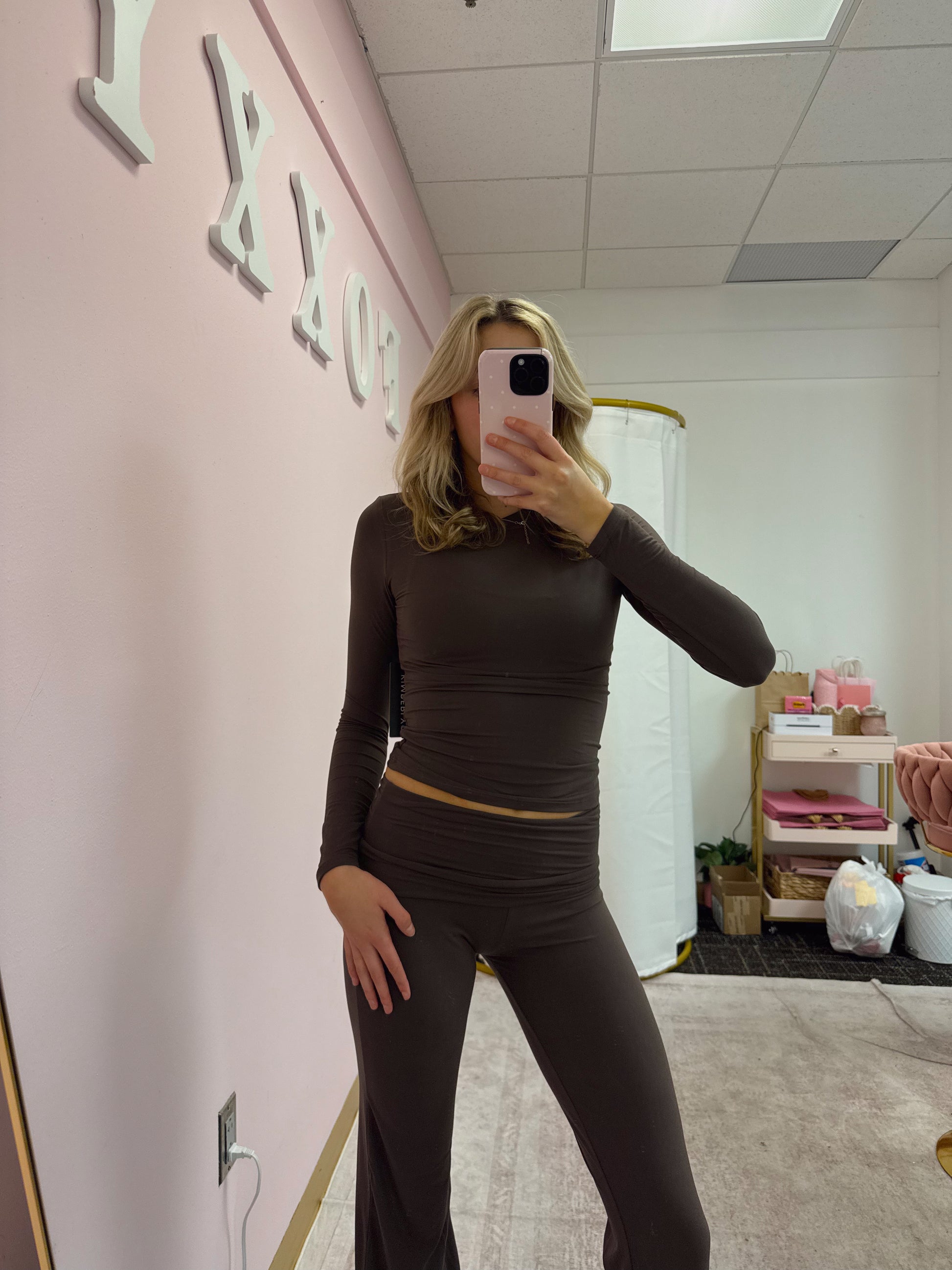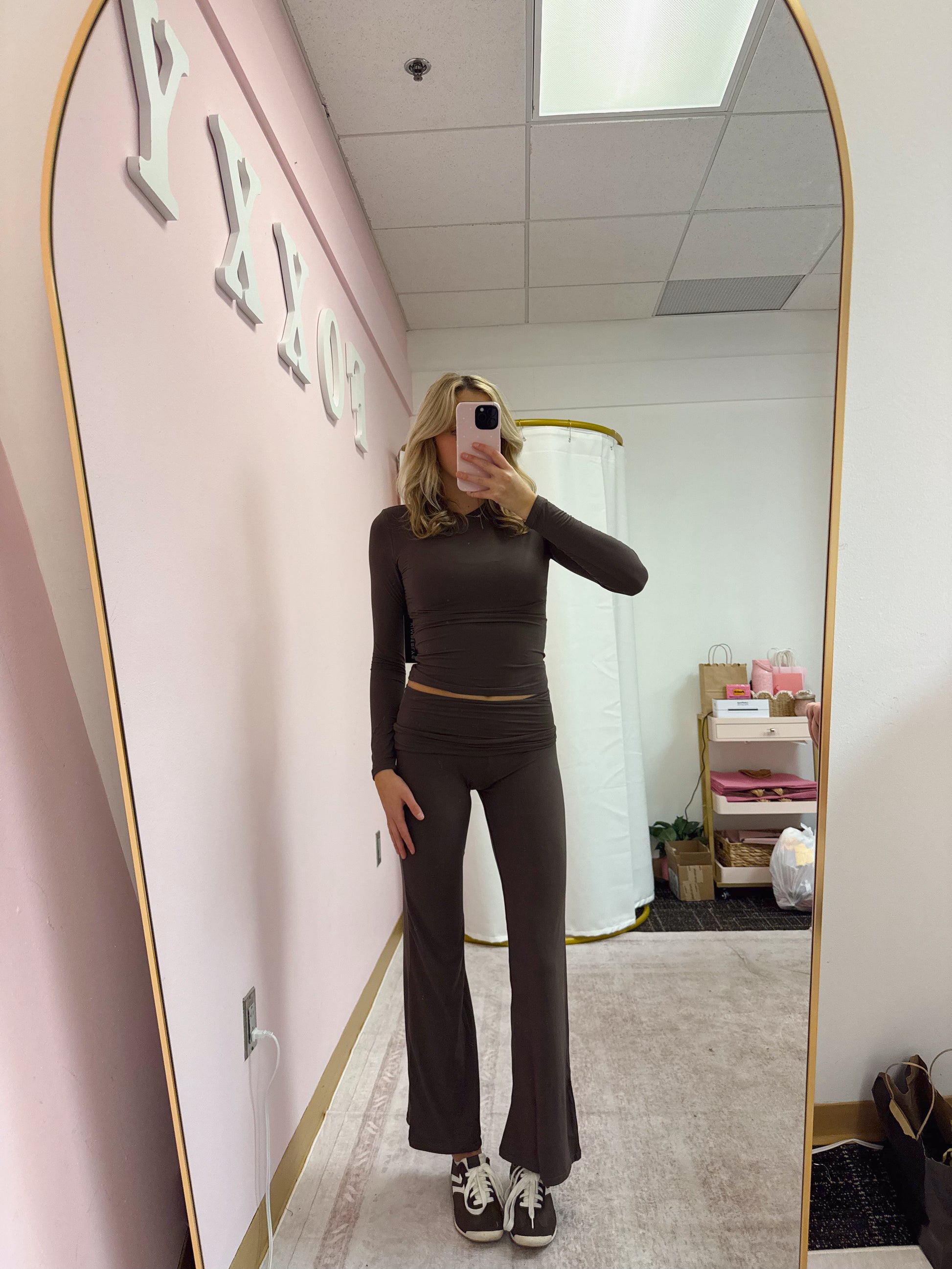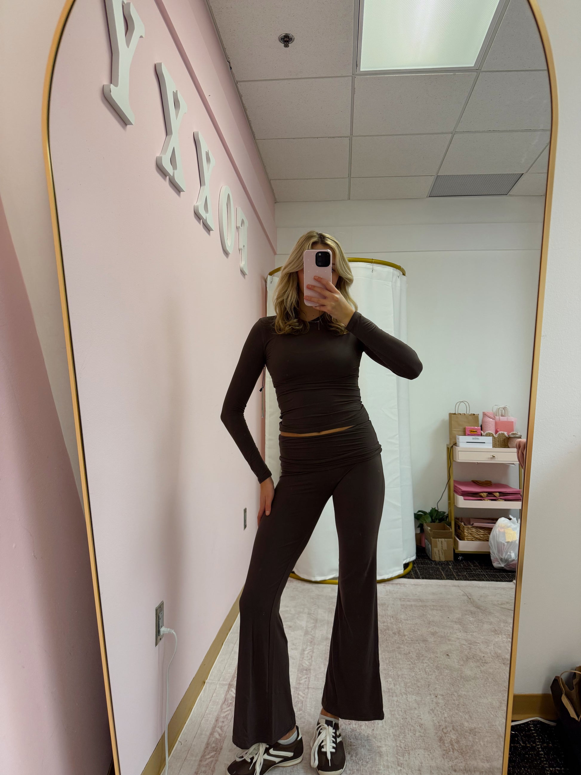 - Matching fold-over waistband flare pants for a lengthened silhouette