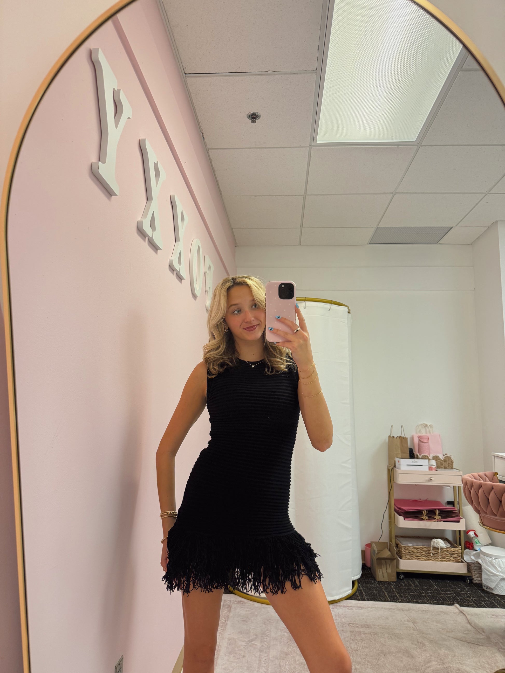 - Sleek sleeveless mini dress with a textured ribbed design and fringe hemline
