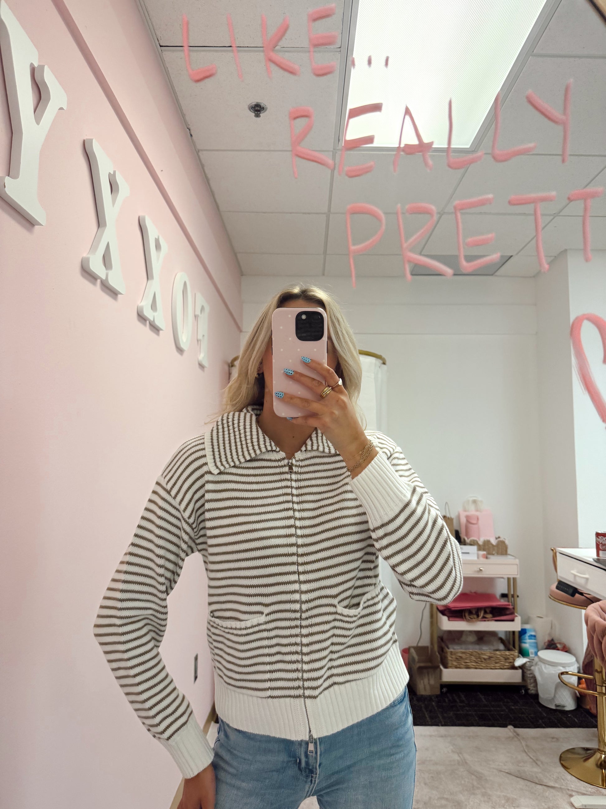 - Cozy knit zip-up sweater with front pockets and a relaxed, slightly cropped fit
