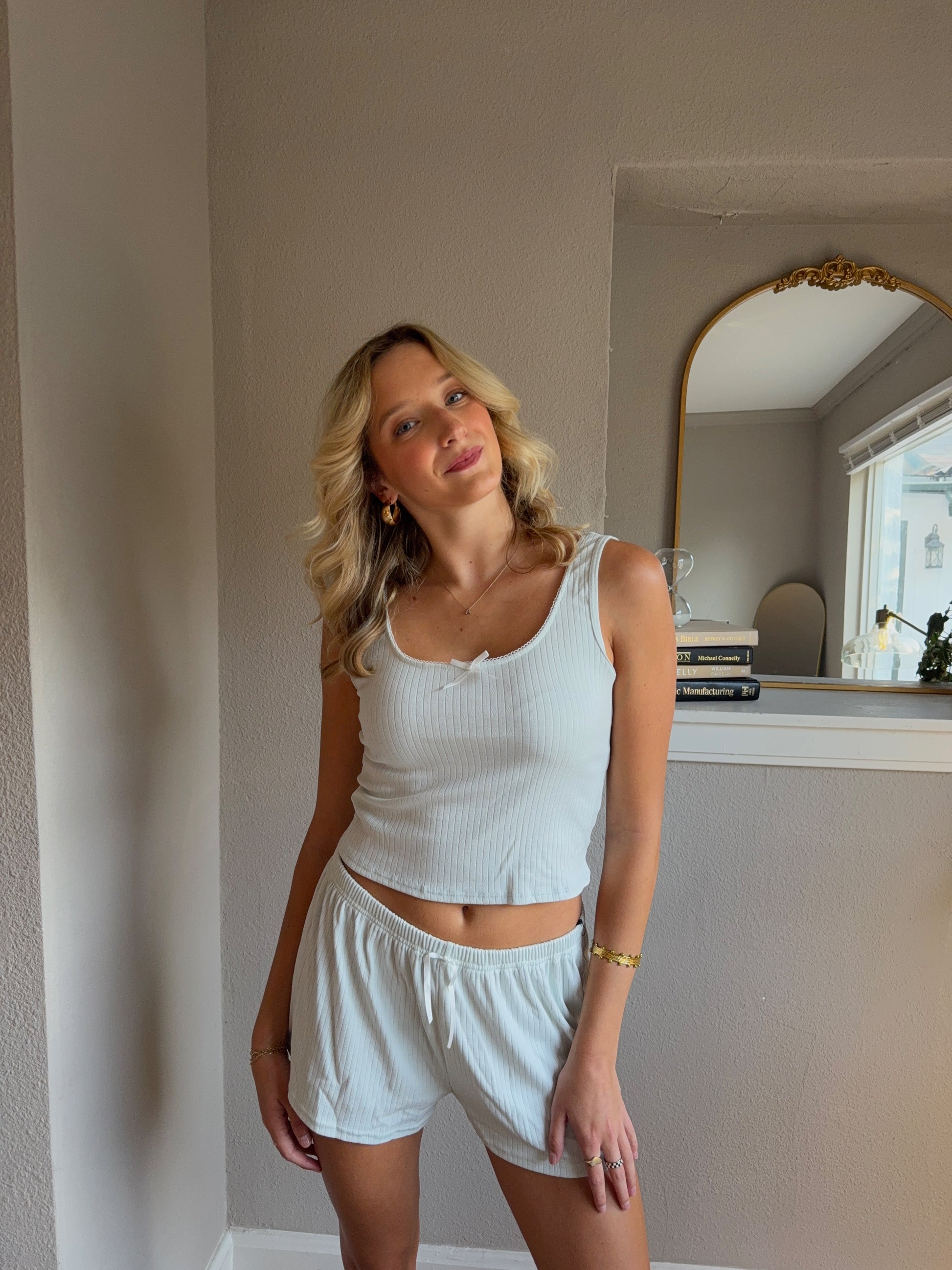 Sizing: True to size – fitted ribbed tank with relaxed flowy shorts