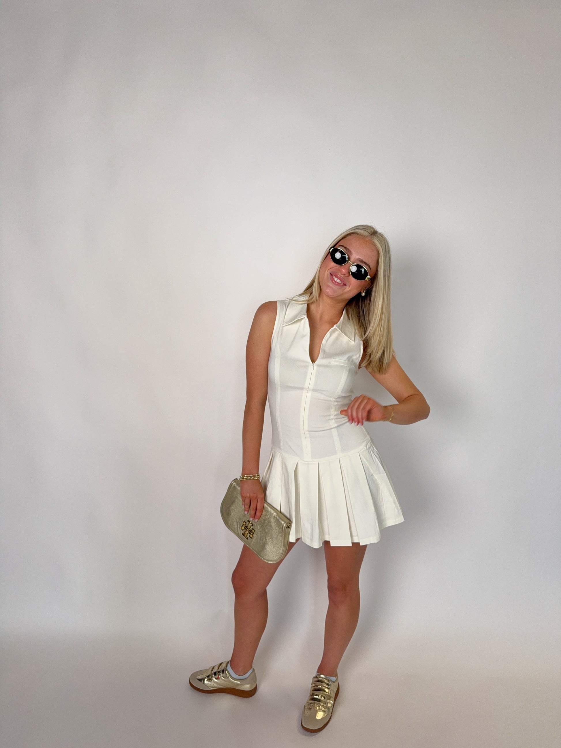 - Drop-waist design that flows into a pleated mini skirt