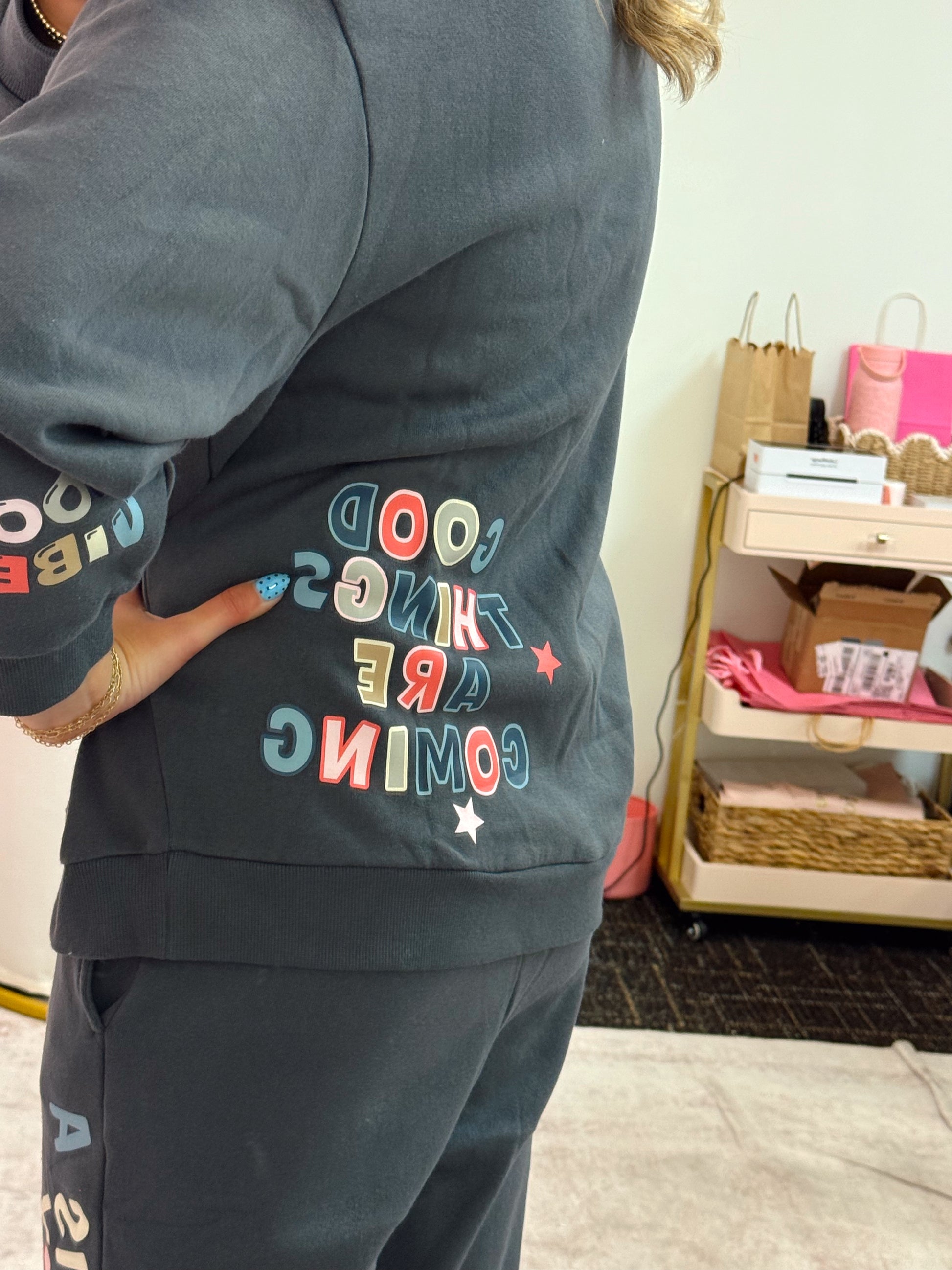 - Crewneck sweatshirt with colorful graphic lettering throughout