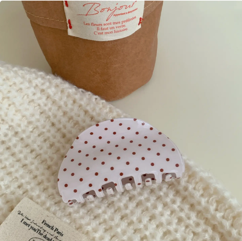 Description: A white claw clip with tiny brown polka dots — simple, sweet, and easy to style.